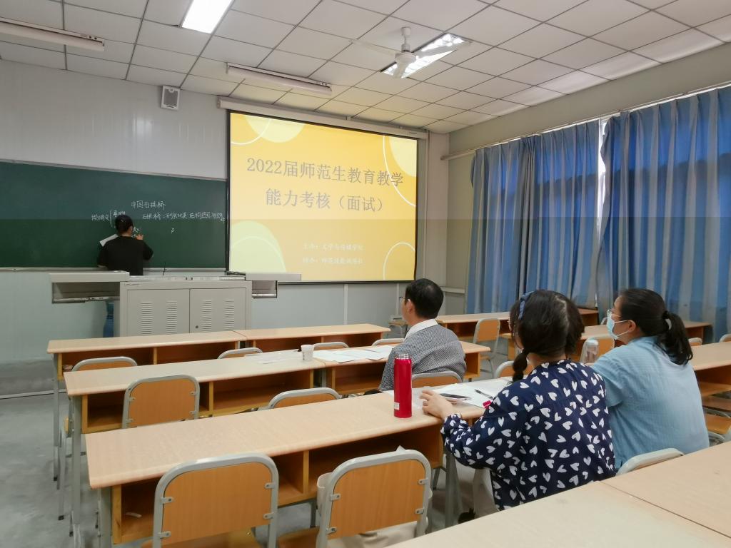 2022年5月8日—9日,拉斯维加斯0567官方网站在江南校区十号教学楼组织了2022届师范生教育教学能力考核(面试)工作。本次面试考核由学院师范技能训练社承办,特聘安康市教研室耿良富、邱俊,汉滨区教研室李玉恒,张滩高中汪嘉雯以及学院八位教师担任考官。